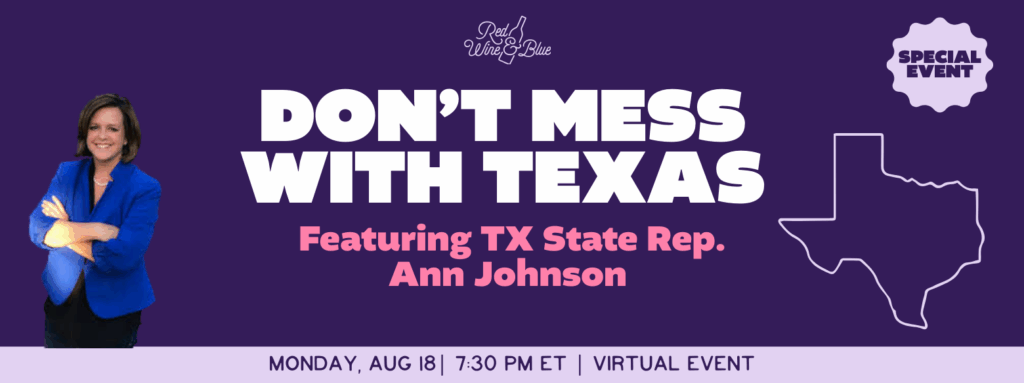 Join Red Wine and Blue for a virtual event to hear from Texas State Rep. Johnson as we discuss why she and her colleagues made the decision to leave the state to block Texas Republicans’ attempt at redrawing congressional maps. We’ll learn about the ongoing fight against extreme gerrymandering in Texas, and why these battles matter far beyond state lines. We will explore what’s at stake for America and what each of us can do to help.
