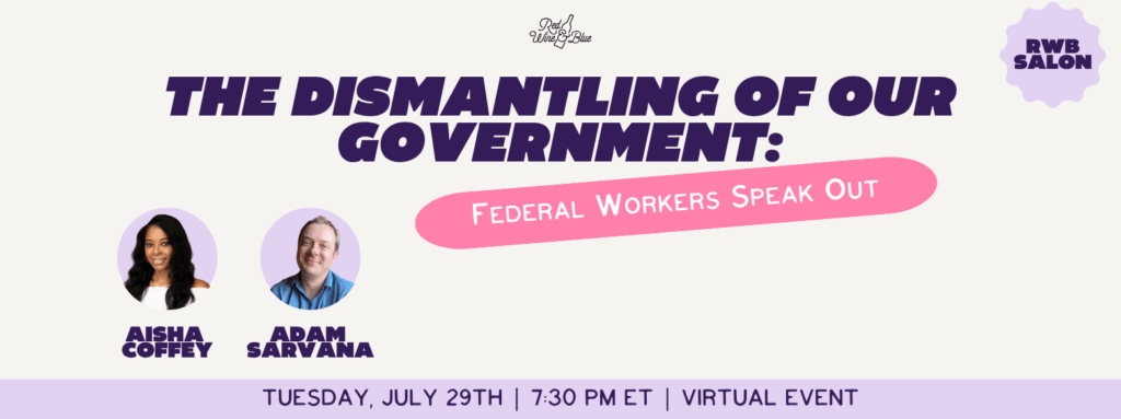 Join Red Wine and Blue for a virtual event to hear directly from former federal workers who will share first-hand experiences of how the firings unfolded, how it has affected their lives, and the impact it will have for all of us. Hear how these workers are fighting back and learn how we all can stand up to protect our our future.